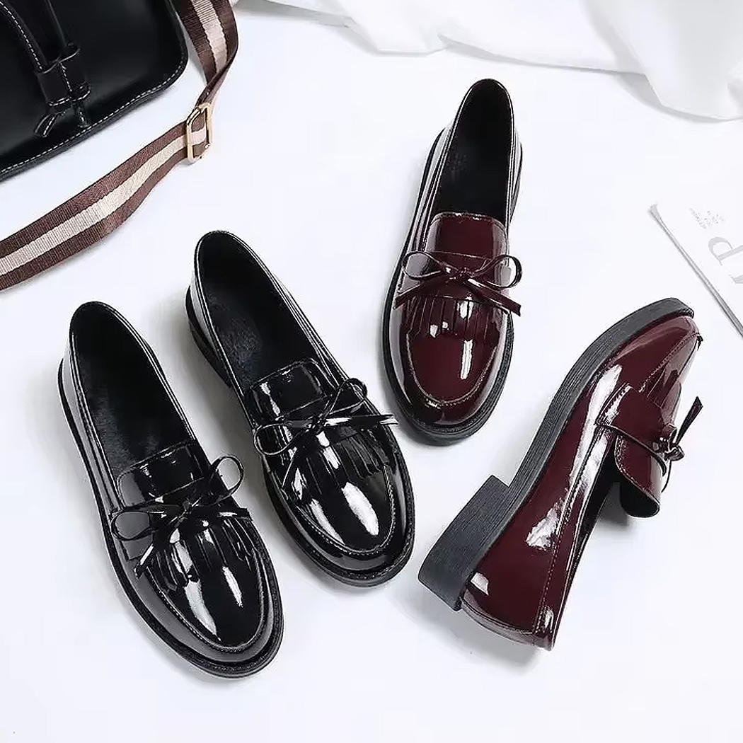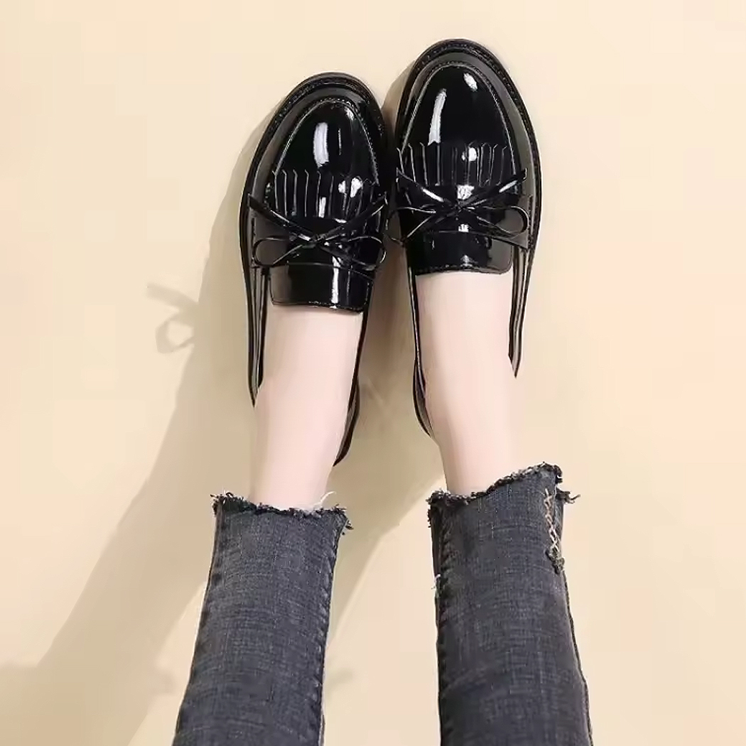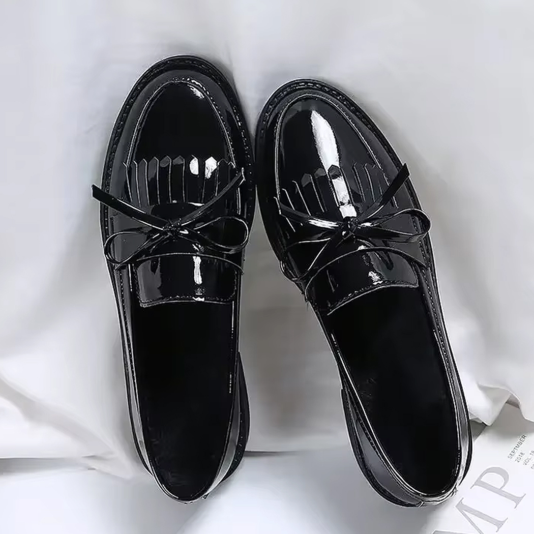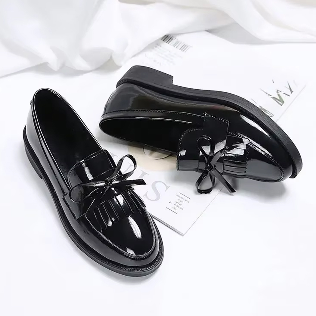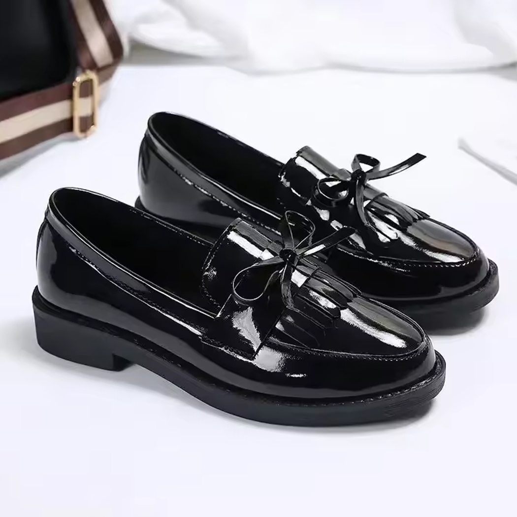 Das glänzende Lackfinish dieses Mokassins fängt das Licht ein und verleiht jedem Schritt einen Hauch von Glamour. Die zarten Fransen und die Schleife sorgen für zusätzlichen Charme und schaffen ein perfektes Gleichgewicht zwischen Klassik und Kühnheit.