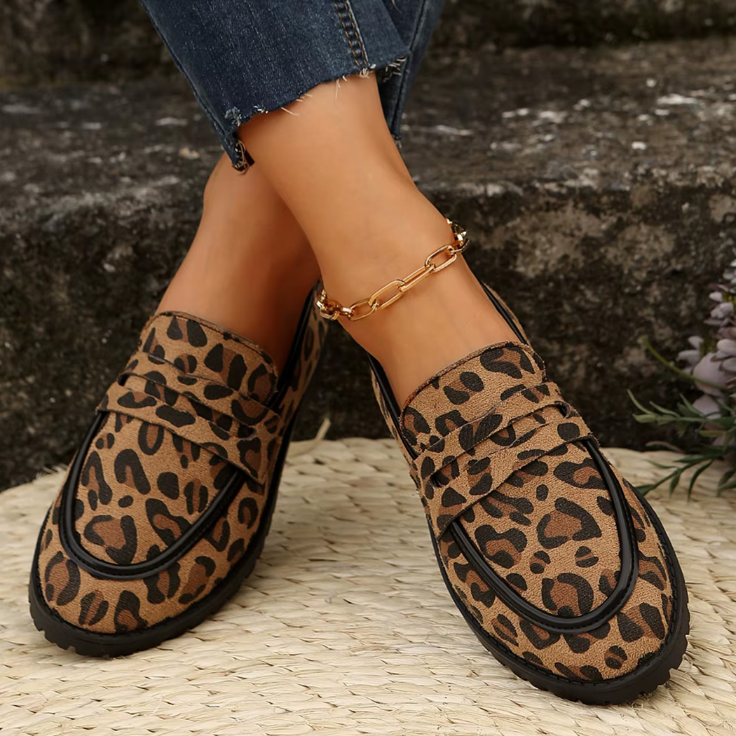 Wagen Sie wilde Eleganz mit diesem Leoparden-Mokassin mit Absatz, ein Muss für Fashionistas auf der Suche nach Charakter.