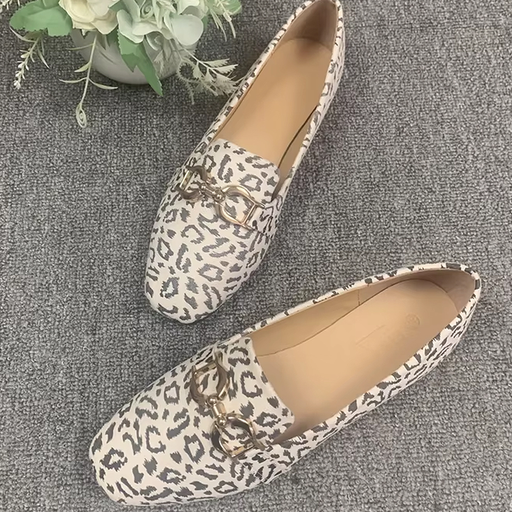 Mit seinem auffälligen Leopardenmuster und der Metallverzierung vereint dieses Modell Charakter und Raffinesse. Er zieht alle Blicke auf sich, ohne jemals übertrieben zu wirken. Ein Mokassin für Frauen, die sich gerne von der Masse abheben, aber trotzdem elegant bleiben wollen.