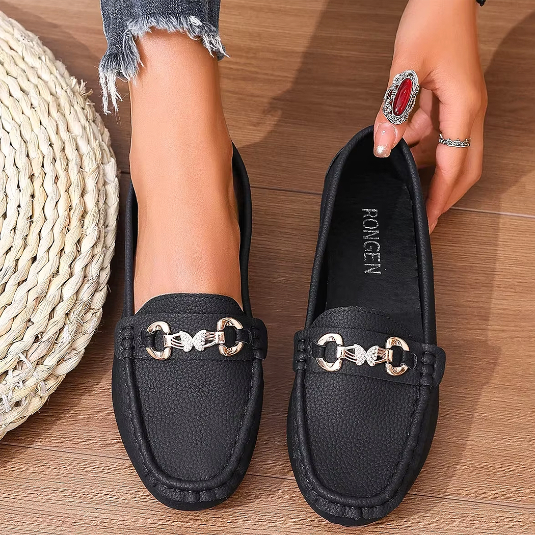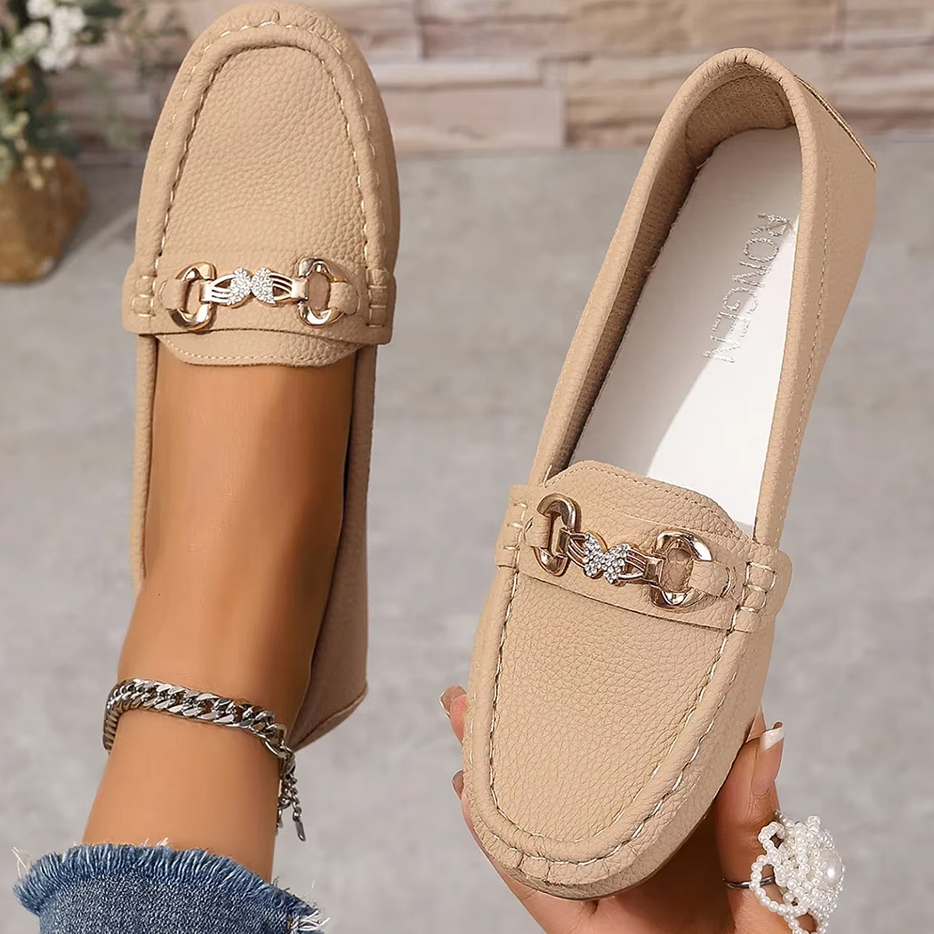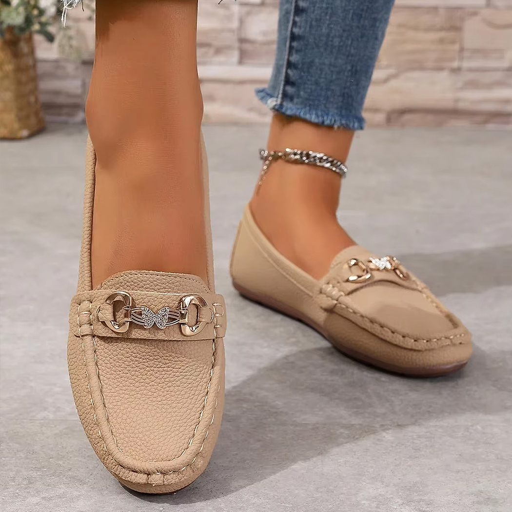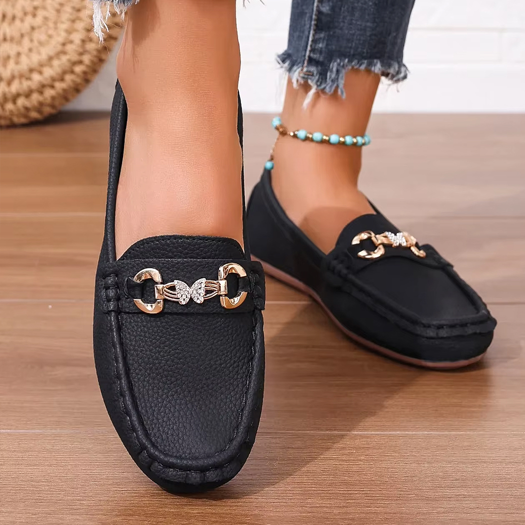 Bringen Sie einen Hauch von Eleganz in Ihren Alltag mit diesen lässigen Mokassins, die mit einem Metallkettendetail und einem Schmetterling aus Strasssteinen verziert sind.