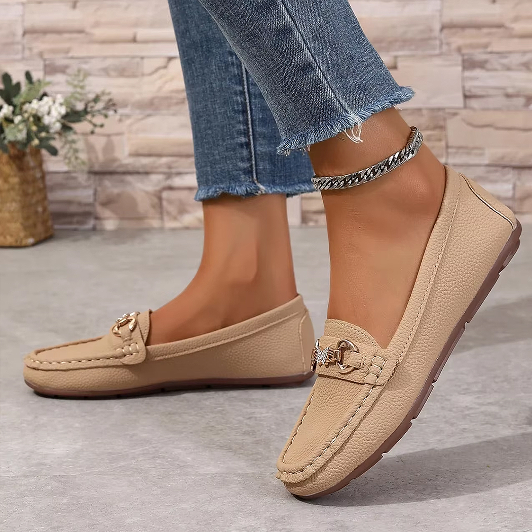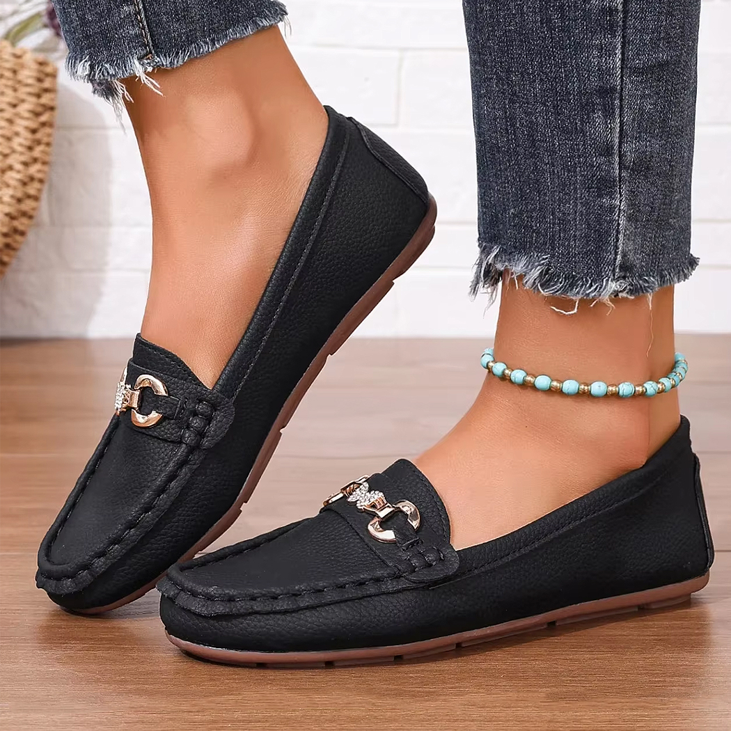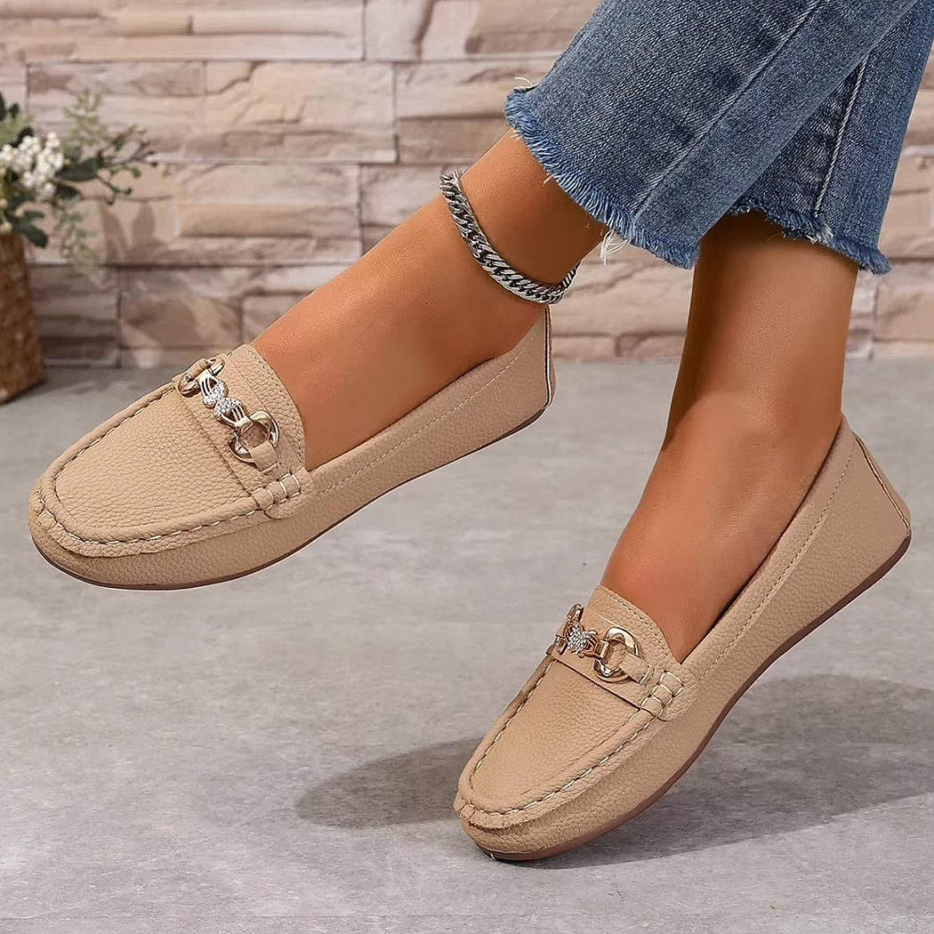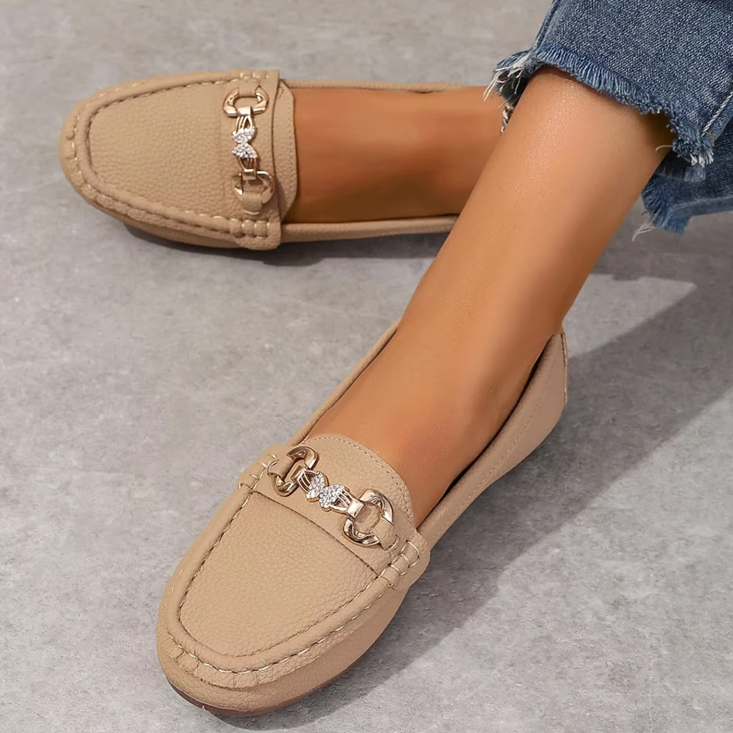 Bringen Sie einen Hauch von Eleganz in Ihren Alltag mit diesen lässigen Mokassins, die mit einem Metallkettendetail und einem Schmetterling aus Strasssteinen verziert sind.